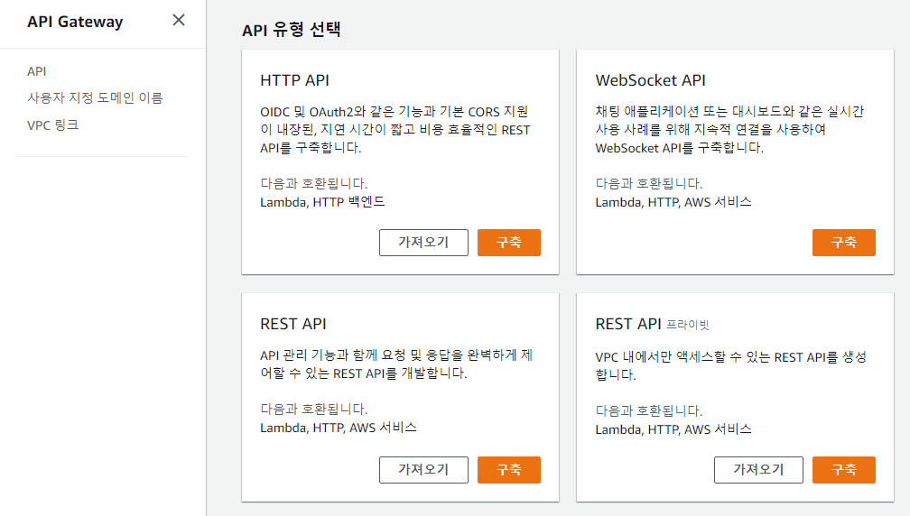 api-gateway에 사용하고자하는 http, rest, websocket API를 구축하고 그 안의 설정에서 메서드와 리소스 방식을 원하는 형식에 맞춰 이용할 수 있다. 그 다음 설정은 json으로 받을지 text형식으로 받을지에 대한 부분과 다른 aws 서비스로의 연결을 위한 정책설정 등은 개념정리이므로 생략하고 aws tutorial 유투브 채널을 이용하면 쉽게 사용가능하다.