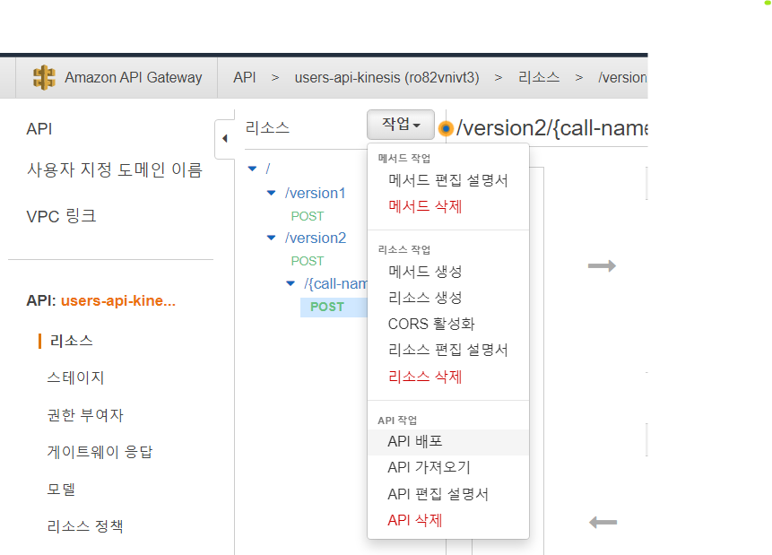 1-2) api를 생성하면 그 하위 작업에서 리소스 생성과 메서드 생성이 있는데 리소스는 활용하자면 여러개의 리소스를 만들어서 버전관리를 한다고 생각하면 편하다. 그 리소스들에 따른 하위 작업으로 메서드를 생성하는데 restapi의 메서드들을 작업할 수 있다.