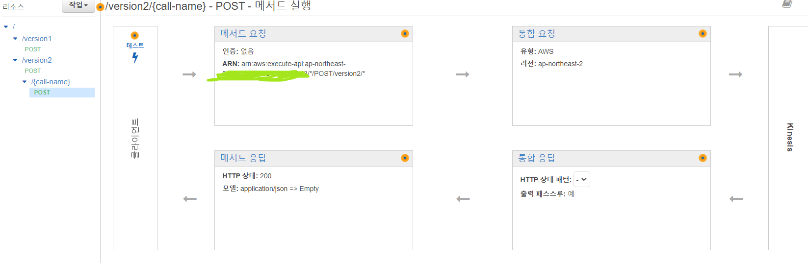 (1-6부분에 역할 설정) 작업에 대한 내용은 Amazone에서 설정한 부분인데 https://docs.aws.amazon.com/ko_kr/apigateway/latest/developerguide/integrating-api-with-aws-services-kinesis.html docs를 읽어보면 자세히 나와있다.